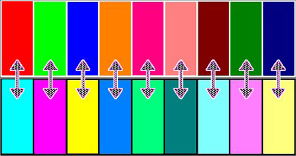 假如兩種色光(單色光或復色光)以適當地比例混合而能產生白色感覺時,則這兩種顏色就稱為“互為補色”。例如,波長為656mn的紅色光和492nm的青色光為互為補色光;又如,品紅與綠、黃與藍、亦即三原色中任—種原色對其余兩種的混合色光都互為補色。補色相減(如顏料配色時。將兩種補色顏料涂在白紙的同一點上)時,就成為黑色。補色并列時,會引起強烈對比的色覺,會感到紅的更紅、綠的更綠。如將補色的飽和度減弱,即能趨向調和。